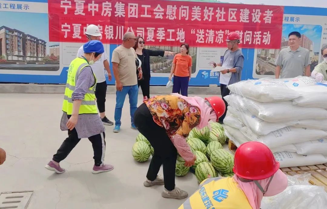 时当盛暑、烈日炎炎,在宁夏中房项目工地上,工友们施工依然热火朝天。为向亲密伙伴致敬,慰问一线工友,7月28日,宁夏中房银川公司为宁夏所有在建项目工地一线六千多名服务人员送上夏日慰问。每年夏季,宁夏中房都会向一线工友们送出防暑降温的清凉慰问品,这个活动,公司已经坚持了很多年。