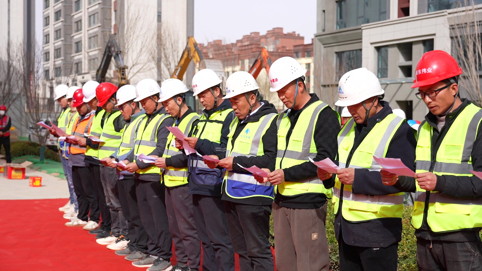 复工仪式上,总、分包单位、监理单位、工友代表、项目负责人等近百位参建者齐聚一堂,共同见证这一激动人心的时刻。特别值得一提的是,今年的复工仪式还特别邀请了宁夏中房的业主代表参与,他们的到来不仅是对项目复工的肯定,更是对未来家园的期待与憧憬。