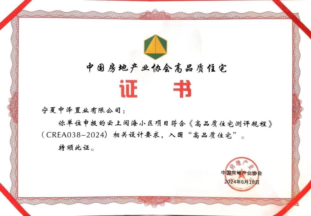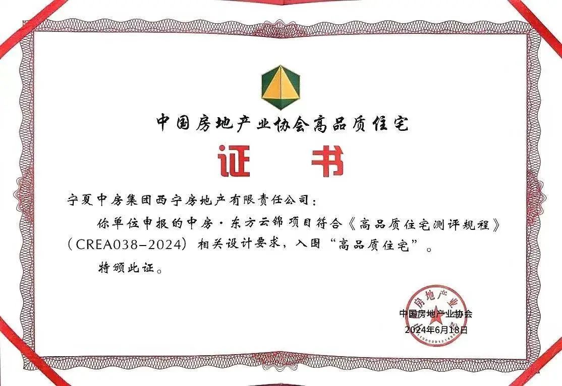 “高品质住宅”评选由中国房地产业协会举办,从项目规划设计、开发建设、交付管理等全周期,对建筑空间、室外环境、建造品质、优良性能、韧性建设、住区管理等多个维度进行全方位测评,聚焦居住者的健康舒适居住体验,满足人民对”好房子”的不断追求。云上阅海、东方云锦分别作为宁夏、青海高品质的科技、健康住宅典范,成功从全国评选项目中脱颖而出,获得首批认证。